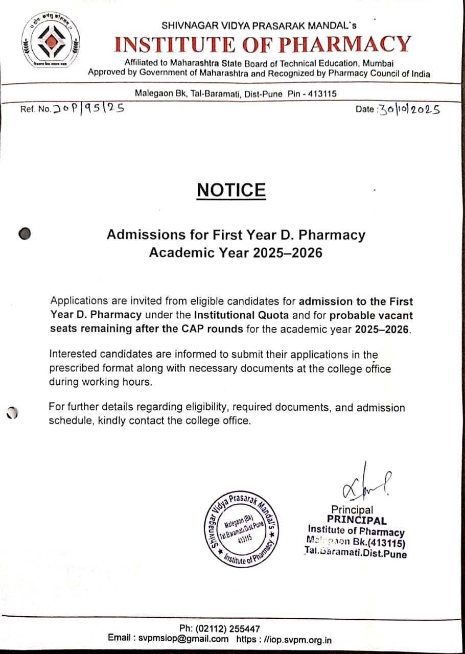 Shivnagar Vidya Prasarak Mandal (SVPM) was established in 1972 with the singular goal of empowering rural communities through educational transformation. As an extension of The Malegaon Sahakari Sakhar Karkhana Ltd., a cooperatively run organization in Shivnagar, Tal. Baramati, SVPM has rapidly developed a comprehensive network of educational activities. These span from Pre-Primary to Post-Graduate levels and include disciplines such as Polytechnic, Engineering, Pharmacy, Business Administration, Computational Sciences...